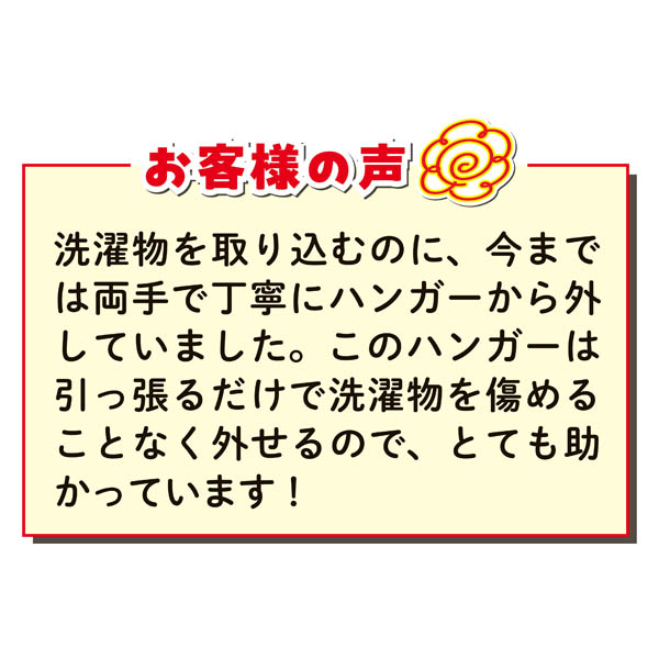 このハンガーは引っ張るだけで洗濯物を傷めることなく外せるので、とても助かっています!